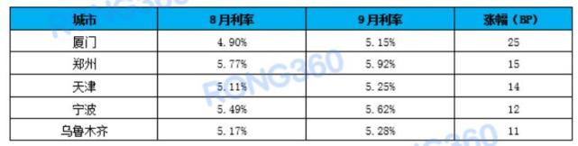 郑州、天津、宁波、乌鲁木齐9月首套房贷款利率环比涨幅也在10BP以上。