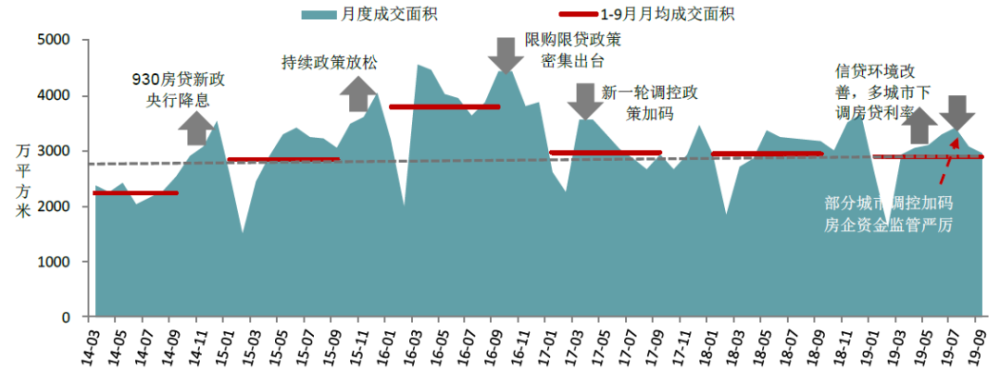2014~2019年9月50个代表城市商品住宅月度成交量走势 数据来源:中指研究院