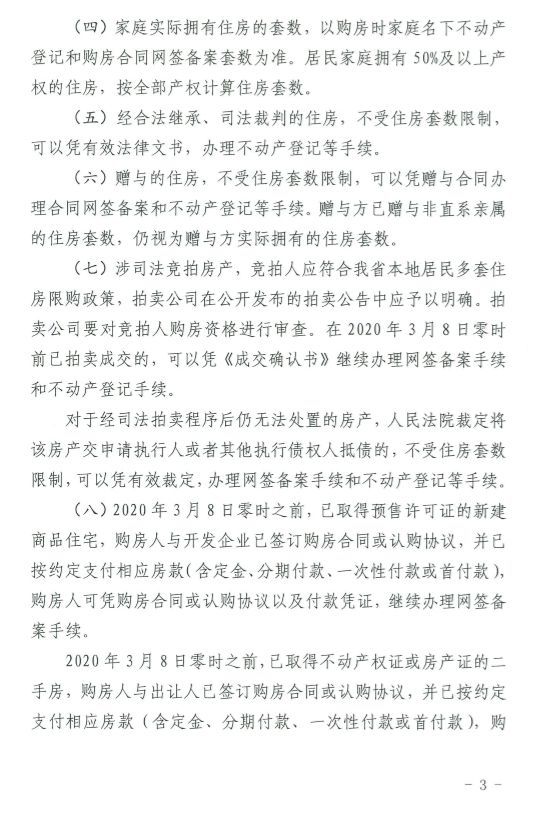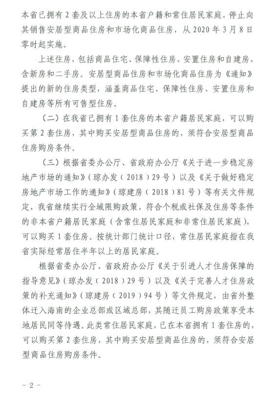 在住房限购方面,海南规定已拥有2套及以上住房的该省户籍和常住居民家庭,停止向其销售安居型商品住房和市场化商品住房,从2020年3月8日零时起实施。上述住房,包括商品住宅、保障性住房、安置住房和自建房,含新房和二手房。由省外整体迁入海南的企业总部或区域总部,其随迁员工购房政策享受本地居民同等待遇。