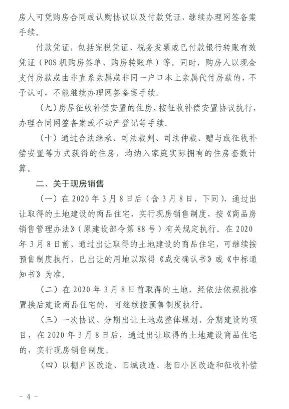 此外,2020年3月8日零时之前,已取得预售许可证的新建商品住宅,或已取得不动产权证或房产证的二手房,购房人与出让人已签订购房合同或认购协议,但购房人以现金支付房款或由非直系亲属或非同一户口本上亲属代付房款的,不予认可,不能继续办理网签备案手续。