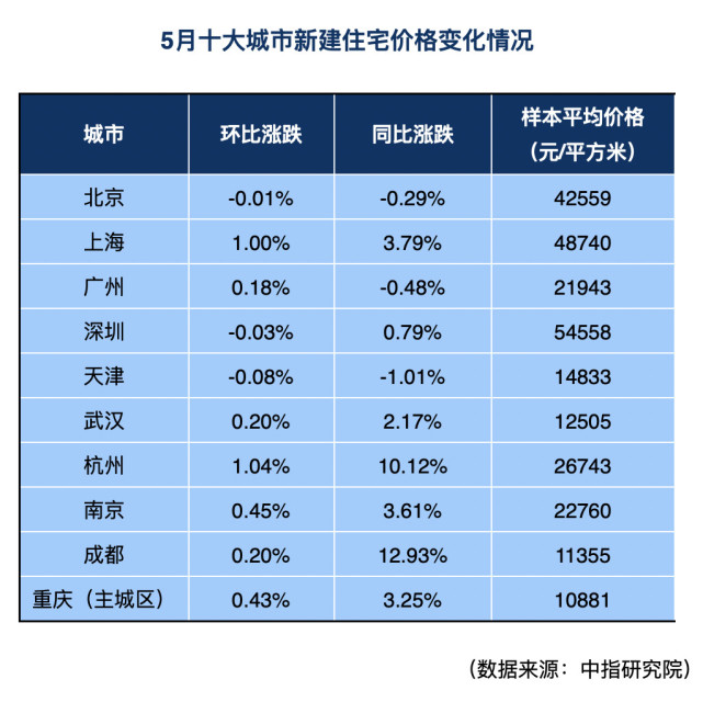 而在5月,这个涨势的格局仍在持续。中指研究院对北京、上海等十大城市(新建)住宅的全样本调查数据显示,5月,杭州、上海新建住宅价格环比分别上涨1.04%和1.00%;南京和重庆(主城区)新建住宅价格环比涨幅在0.4%-0.5%之间;成都、武汉和广州涨幅则在0.2%以内。天津、深圳和北京环比微跌。