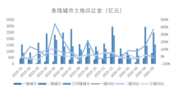 2020年1-5月一线城市累计成交土地金额2737.4亿元,较2019年同期(1352.9)同比增加102.3%,涨幅在各线城市中最为明显。二线城市和三四线城市则不同于一线城市,二线城市累计成交土地金额8564.8亿元,三线城市累计成交土地金额4899.0亿元,同比分别下降2.9%、5.6%,基本与上一年同期持平。疫情过后,一线城市土地市场成交量价大幅攀升,而二线及三四线城市的市场反应则相对滞后,出现了下降。