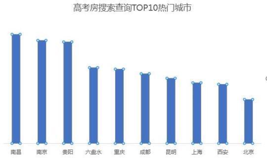 从同程旅行平台上入住日期在7月6-9日之间的考点周边酒店搜索量来看,南昌、南京、贵阳、六盘水、重庆、成都、昆明、上海、西安、北京10个城市的“高考房”搜索量目前为止位居全国前列,前十名非一线城市占比超过一线城市。