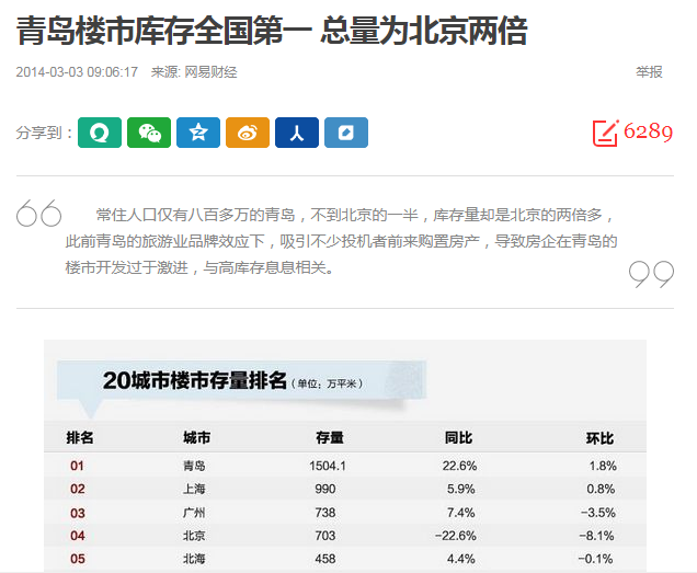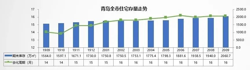 那库存呢?九月底已经突破了2000万方的整数关口,上升至2060.7万方,创历史最高纪录,事实上,早在去年底青岛楼市库存已经刷新了五年前去库存时的纪录,过去一年库存量增加了500万方。