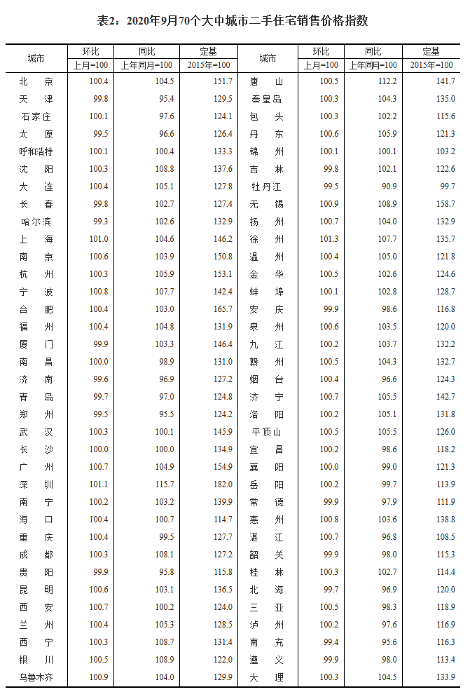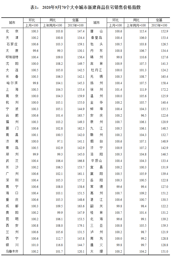 发表日期:2020-10-20国家统计局今日(10月20日)公布的《70个大中城市商品住宅销售价格变动情况》显示,9月份70个大中城市新建商品住宅价格环比上涨的城市有55个,环比下跌的城市有8个,7个城市环比持平。上个月这一数字分别为59个、9个和2个。二手住宅方面,环比上涨的城市有50个,环比下跌的城市有17个,3个城市持平。上个月这一数字分别为47个、18个和5个。