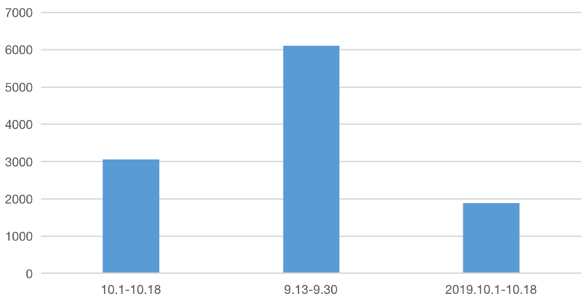 经历短暂降温之后,10月5日,二手房成交套数迅速反弹至111套,至10月9日,成交套数已恢复282套相对高位。从10月1日至10月18日数据来看,二手住宅总成交套数达到3059套,环比(9月13-30日)减少99%,成交明显缩量,但相较于2019年同期仍增长62%。