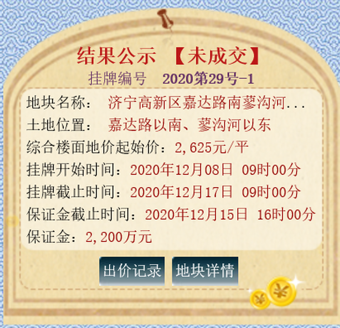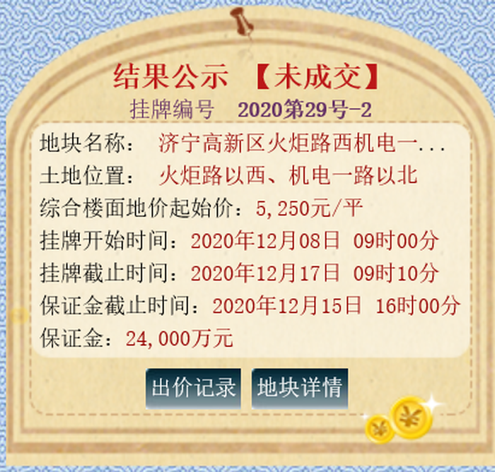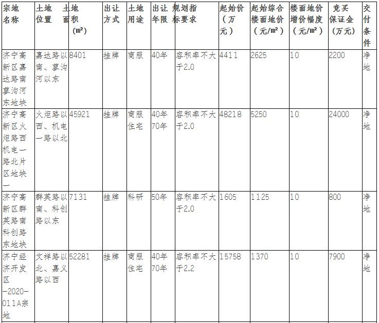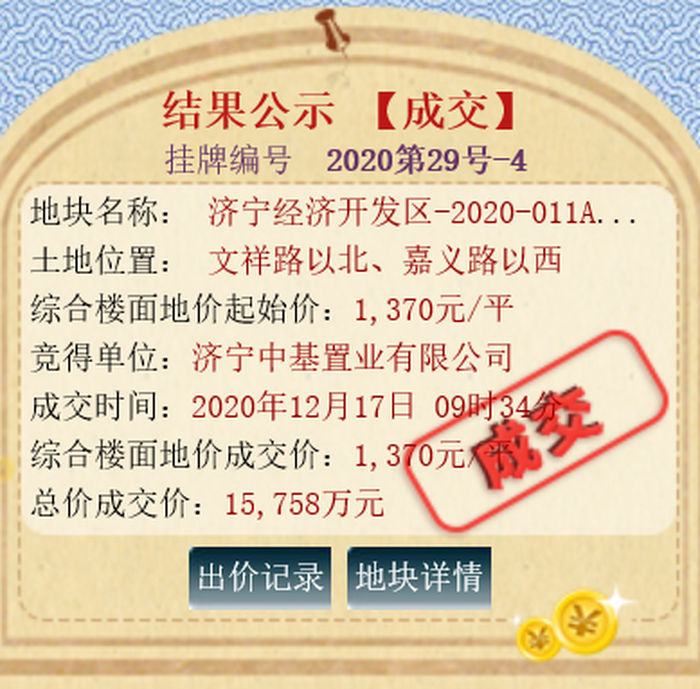 该地块位于文祥路以北、嘉义路以西,土地面积52281m ,土地用途商服住宅用地,出让年限:商服40年,住宅70年;规划容积率不大于2.2。拍卖起始价为15758万元,综合楼面价为1370元/㎡;最终被济宁中基置业有限公司底价竞得。