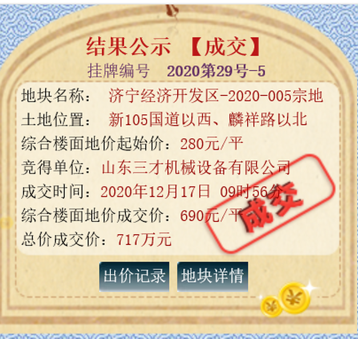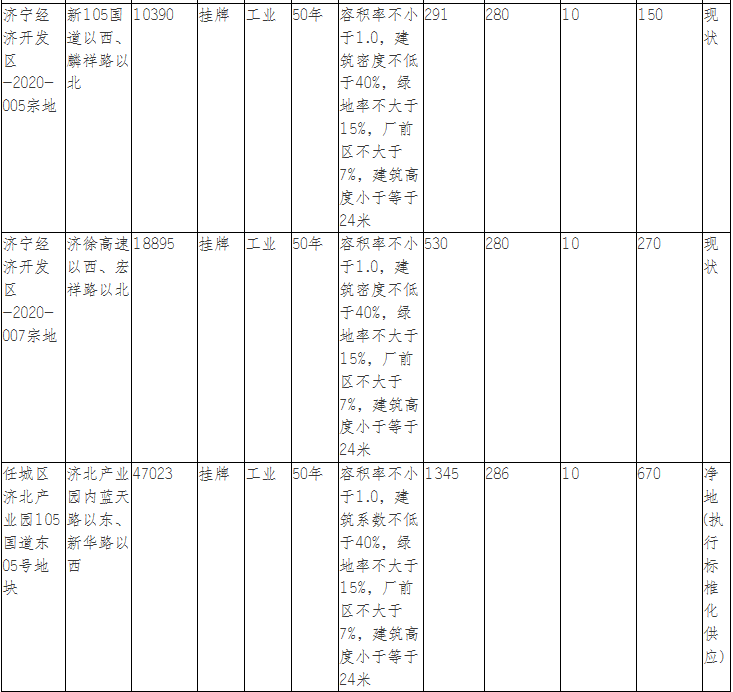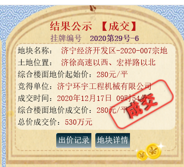 该地块位于济徐高速以西、宏祥路以北,土地面积10390m ,土地用途工业用地,出让年限50年;规划容积率不小于1.0,建筑密度不低于40%,绿地率不大于15%,厂前区不大于7%,建筑高度小于等于24米。拍卖起始价为530万元,综合楼面价为280元/㎡;最终被济宁环宇工程机械有限公司底价竞得。