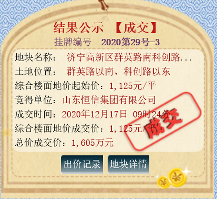 该地块位于群英路以南、科创路以东,土地面积7131m ,土地用途科研用地,出让年限50年;规划容积率不大于2.0。拍卖起始价为1605万元,综合楼面价为1125元/㎡;最终被山东恒信集团有限公司底价竞得。