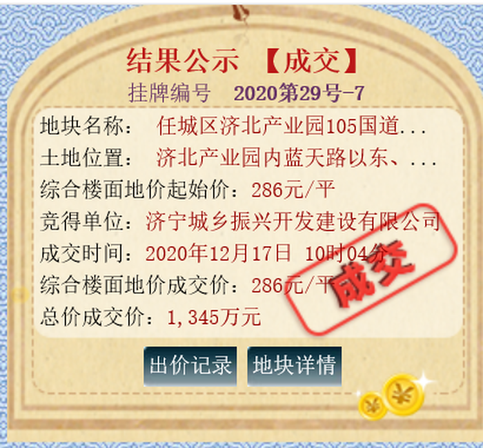 该地块位于济北产业园内蓝天路以东、新华路以西 ,土地面积47023m ,土地用途工业用地,出让年限50年;规划容积率不小于1.0,建筑系数不低于40%,绿地率不大于15%,厂前区不大于7%,建筑高度小于等于24。拍卖起始价为1345万元,综合楼面价为286元/㎡;最终被济宁城乡振兴开发建设有限公司底价竞得。