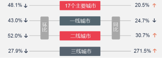上周一线城市整体环比下降43.0%,广州降幅较大,约为66.7%;上海居其次,降幅为41.6%;仅深圳成交有所上升。同比来看,受春节假期影响,同比均不同程度下降。