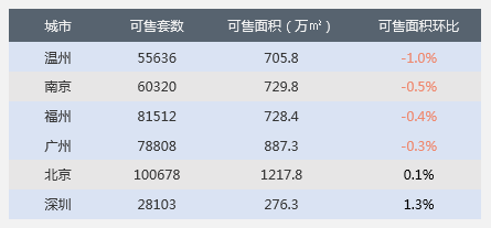 监测的6个代表城市库存环比整体下降0.25%。监测的城市中,温州库存降幅较大,为1.0%,南京、福州和广州降幅均在1%以内;监测的城市中,深圳环比升幅较大,为1.3%。
