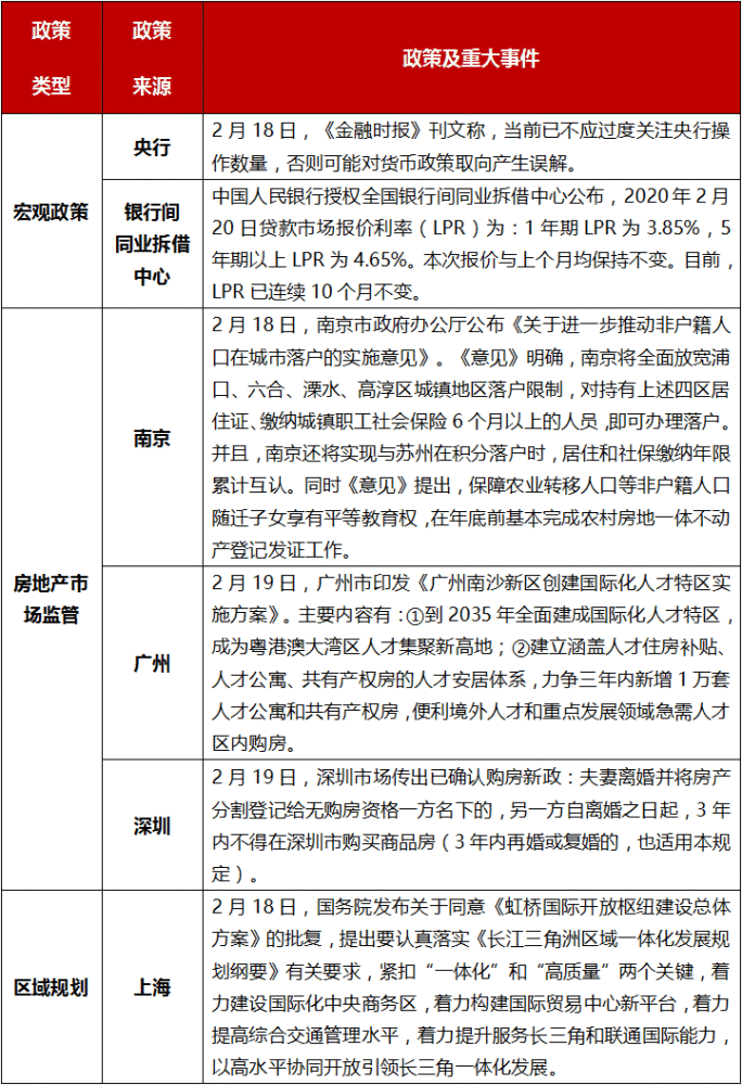 银行间同业拆借中心发布最新LPR:1年期LPR为3.85%,5年期以上LPR为4.65%,连续10个月保持不变。南京发布落户新政,四区持居住证、社保满6个月即可落户。深圳发布购房新规,打击“假离婚”购房;广州南沙区印发人才新政,建立涵盖人才住房补贴、人才公寓、共有产权房的人才安居体系,力争三年内新增1万套人才公寓和共有产权房。