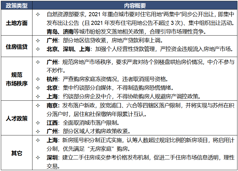发表日期:2021-03-032021年2月,各地方政府继续灵活因城施策、多措共举稳楼市。北上广深杭等多地出台楼市调控政策,内容涉及土地出让、住房信贷收紧、规范房地产市场秩序等方面。此外,针对人才落户、人才购房等方面,部分城市调控措施较为积极。
