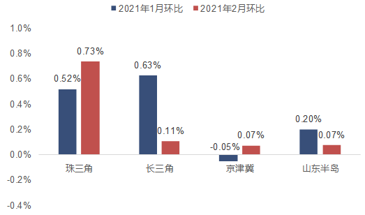 春节月,百城新建住宅价格环比涨幅虽明显收窄,但各主要城市群表现各异。根据中国房地产指数系统百城价格指数对全国100个城市新建及二手住宅调查数据,2月珠三角新房市场表现活跃,新建住宅价格整体环比涨幅居各城市群首位,涨幅较上月扩大0.21个百分点,广州、中山等城市新建住宅价格环比涨幅居前列;长三角部分城市受前期调控政策持续影响,本月新建住宅价格环比涨幅明显收窄;京津冀及山东半岛新建住宅价格整体涨幅依旧保持在较低水平。