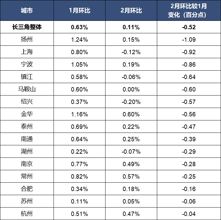 表:长三角部分城市新建住宅价格环比涨跌变化