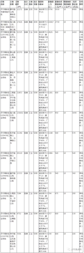 土地位于:大禹西路以北、济宁通华以东;土地面积:7284㎡(约11亩);土地用途:工业用地;出让年限:50年;容积率不小于0.8;起始价:394万元,综合楼面价起价:675元/㎡;交付条件为净地(执行标椎化供应);