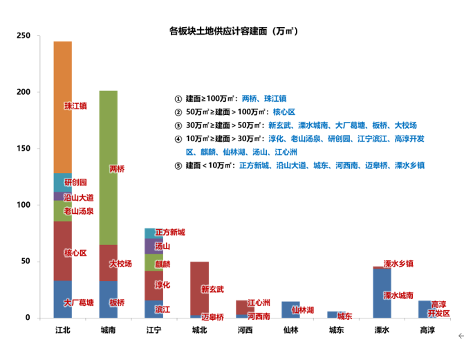 从供应土地属性来看,纯住宅用地仍为供应主力,以小体量地块为主,此外,本次供应的综合地块占比明显提升,以珠江镇、两桥、新玄武、核心区等热点板块为主。