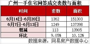 来自网易房产数据中心监控阳光家缘数据显示,上周(6月14日-6月20日)广州一手住宅网签成交1362套,环比上升9.05%;面积方面,上周广州一手住宅网签面积为151303平方米,环比上升10.12%。