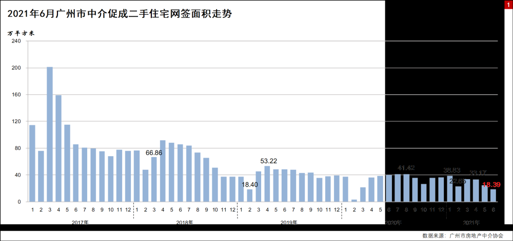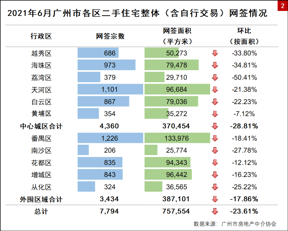 据广州市房地产中介协会数据,6月(统计周期为2021年5月26日至2021年6月25日),广州全市二手住宅网签(含中介促成+自行交易)7794宗、建面75.76万平方米,环比分别下降25.94%和23.61%。