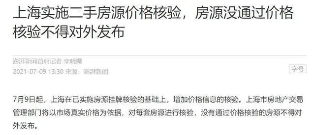 7月9日,上海房管部门召开了二手住房房源管理会议,对挂牌的二手房不仅要核验房源的真实性,还要对价格信息进行核验。上海二手房价格核验具体操作是,一般先由房产中介等机构向官方平台提交拟挂牌的相关房源信息进行核验,除了房源所在小区、楼层等自身信息外,还要提交拟挂牌价格进行核验。如果提交的价格高于该小区的市场真实价格,则不能通过核验,该房源也就不得对外发布。