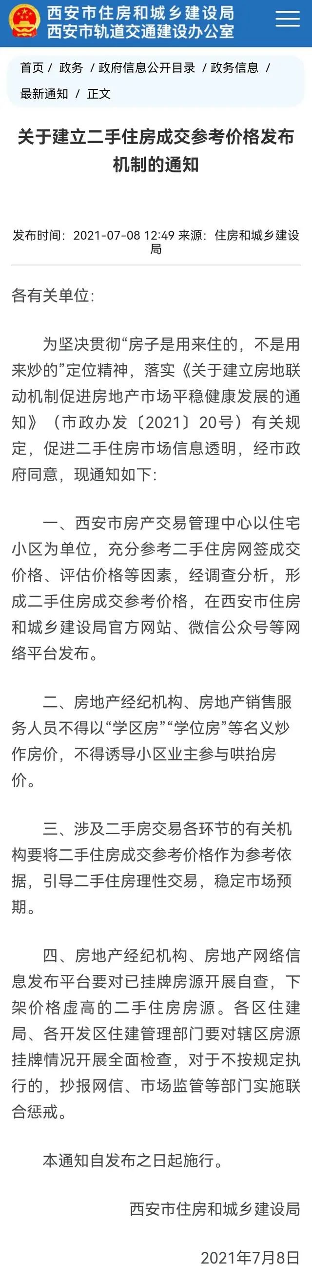 而在上海出台新政的前一天,也就是7月8日,西安市住房和城乡建设局发布《关于建立二手住房成交参考价格发布机制的通知》,通知提到,由二手住房网签成交价格、评估价格等因素,经调查分析,形成二手住房成交参考价格,在西安市住房和城乡建设局官方网站、微信公众号等网络平台发布。涉及二手房交易各环节的有关机构要将二手住房成交参考价格作为参考依据,引导二手住房理性交易,稳定市场预期。