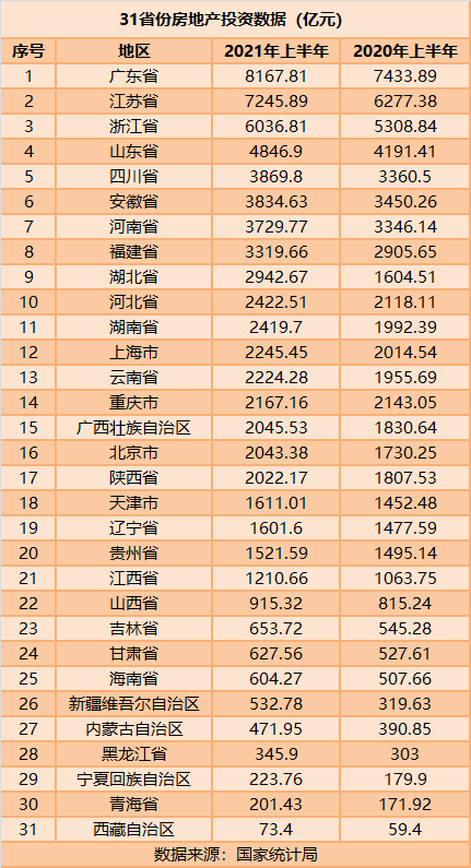 从统计数据来看,上半年,广东、江苏、浙江三省份房地产开发投资分别达到8167.81亿元、7245.89亿元、6036.81亿元,居全国前三。