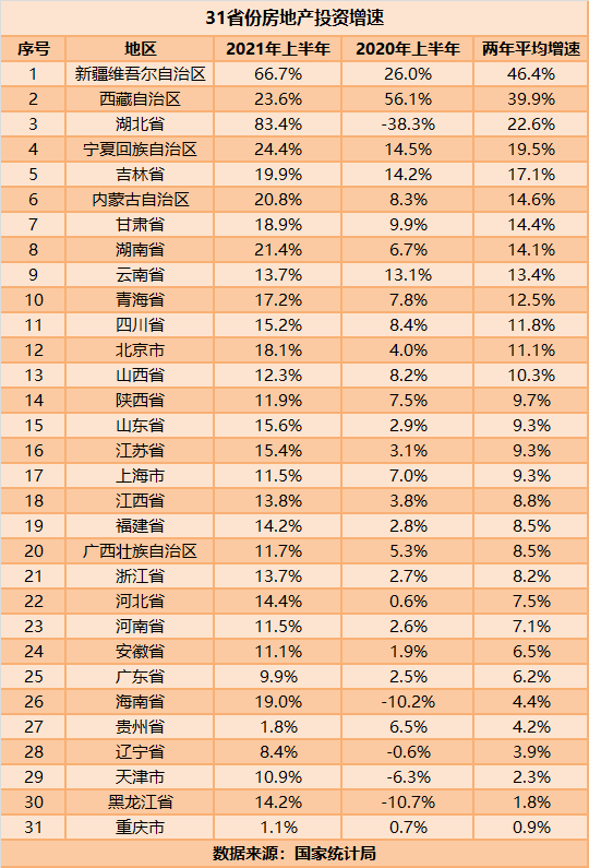从31省份房地产开发投资增速数据来看,上半年湖北增速位居全国榜首,为83.4%。紧随其后的新疆、宁夏,增速分别为66.7%、24.4%。